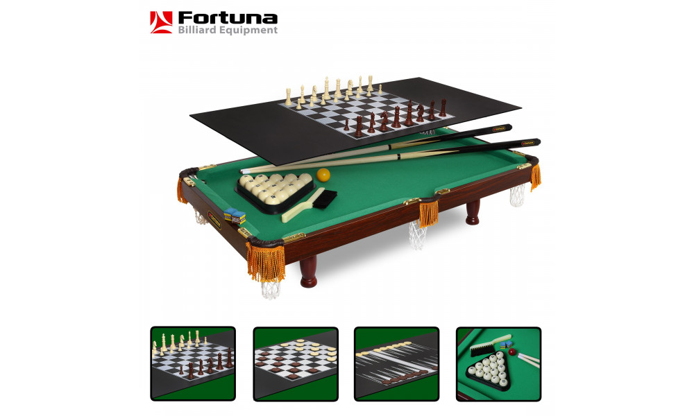 Бильярдный стол Fortuna Русская пирамида 3 фута 4 в 1 - это многофункциональный игровой стол, включающий 4 игры: русский бильярд, шашки, шахматы и нарды.