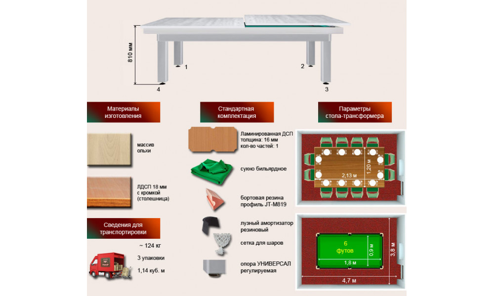 Поставляется в собранном виде и не требует специалиста по сборке. Насладитесь всеми преимуществами обеденного бильярдного стола «Спартак»!